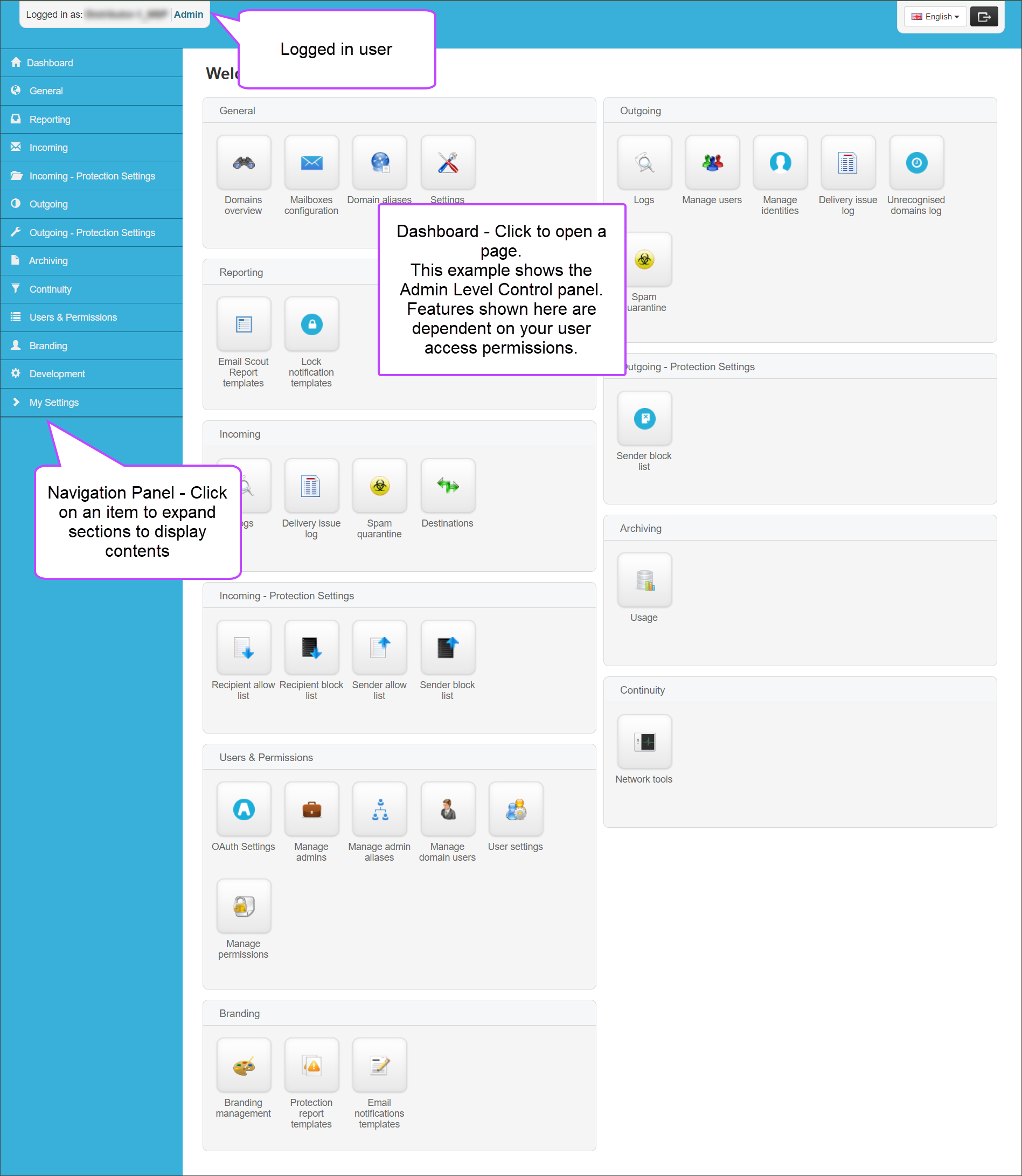 To navigate Zerospam.eu Control Panel, use the left-hand Navigation menu and Dashboard to move around the system.