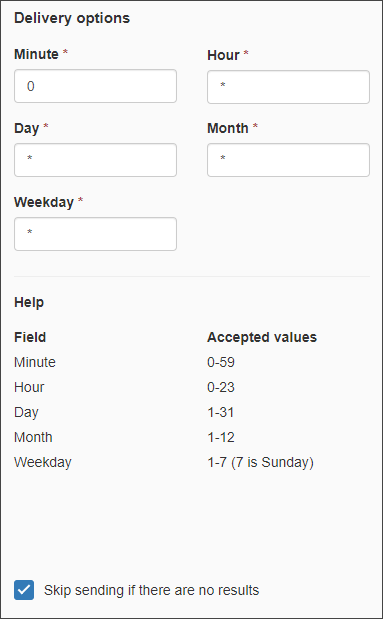 • Advanced – Specify your advanced repeat schedule (in a ‘crontab’ style format)