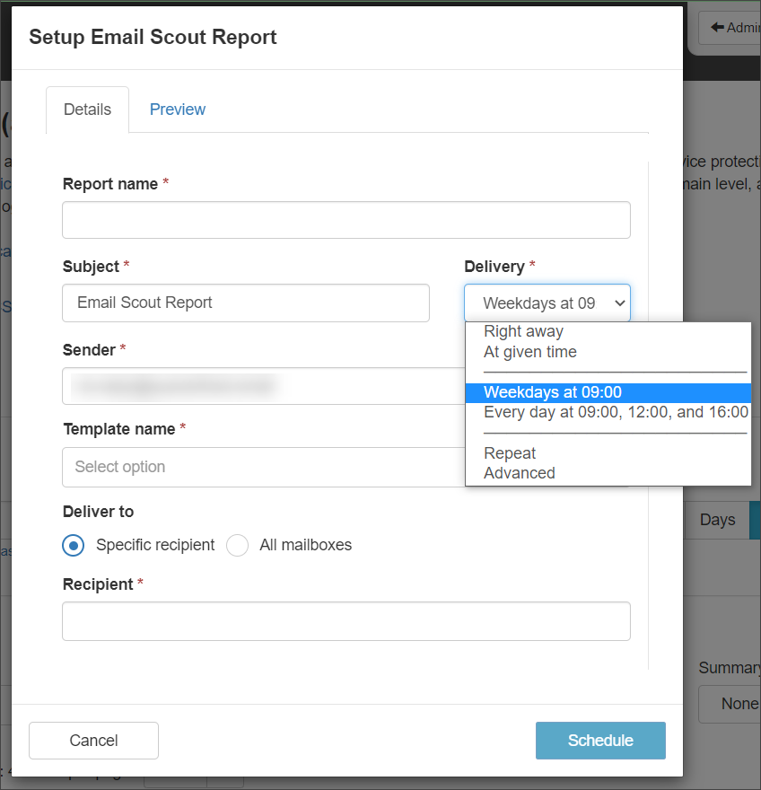 • Weekdays at 09:00 – Send the report to the specified recipient(s) every weekday at 9am