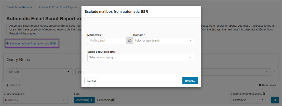 When activated, Email Scout Reports are automatically sent to all detected mailboxes in a domain. However, there may be specific mailboxes in the domain that should not receive Email Scout Reports. In addition to manually added exclusions, this list also contains those mailboxes where the recipient chose to unsubscribe.