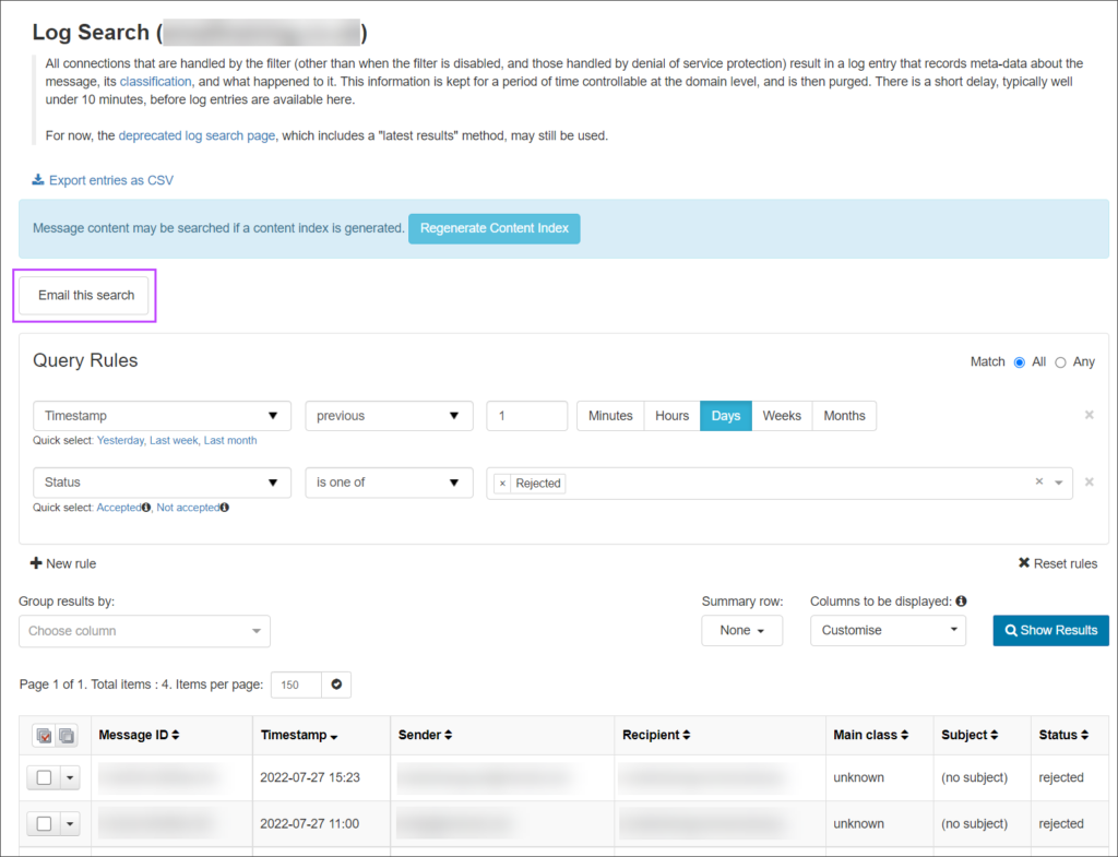 3. Click on Show Results to display messages matching the query rules