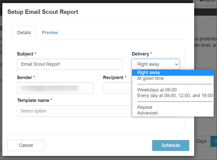1. The Setup Email Scout Report dialog is displayed in the Details tab. In the Subject field enter the subject for the report: this will be the subject of the report email received by the user