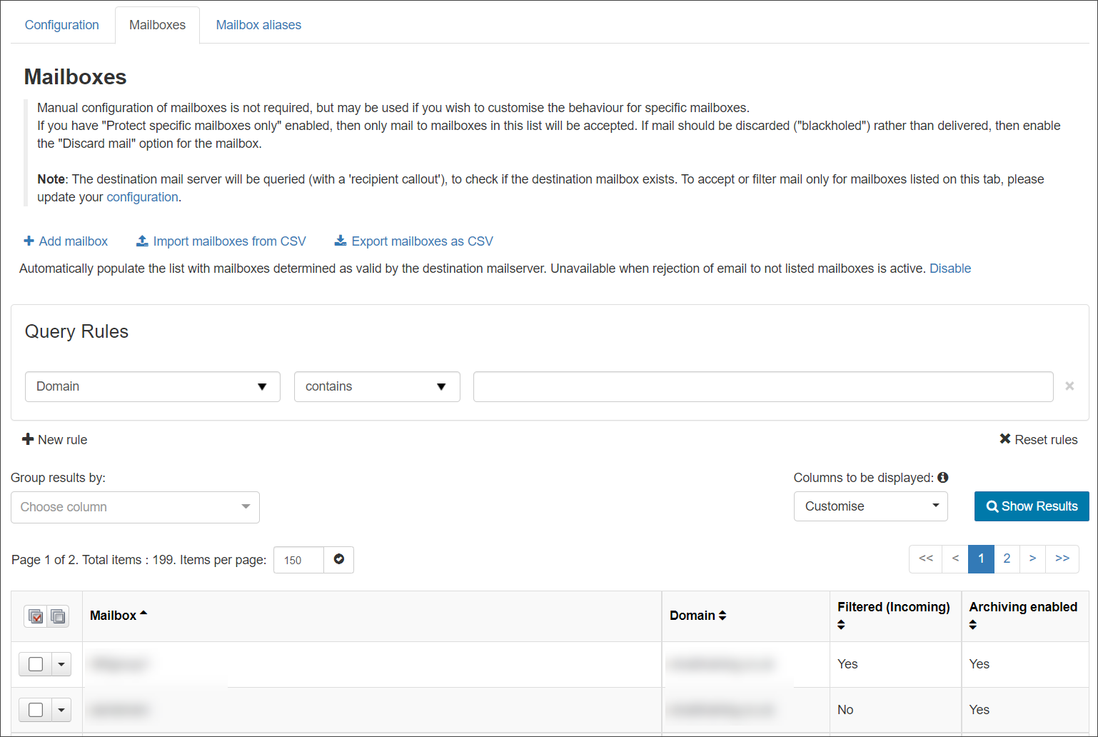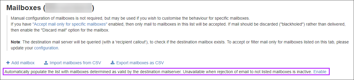 If you have Automatically populate the list with mailboxes determined as valid by the destination mailserver… enabled, mailboxes will be detected and configured automatically but you may want to add and customise the behaviour of specific mailboxes.